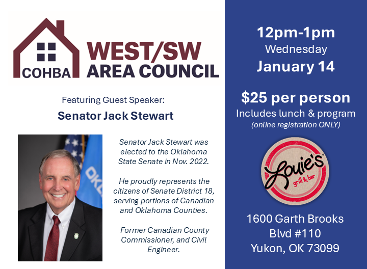 Guest Speaker: Senator Jack Stewart. Senator Jack Stewart was elected to the Oklahoma State Senate in Nov. 2022. He proudly represents the citizens of Senate District 18, serving portions of Canadian and Oklahoma Counties. Former Canadian County Commissioner, Civil Engineer.
