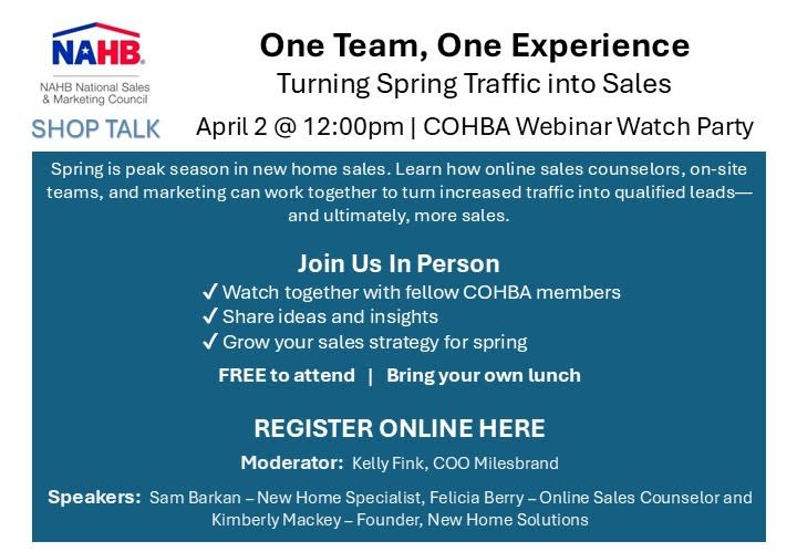 Spring is peak season in new home sales. Learn how online sales counselors, on-site teams, and marketing can work together to turn increased traffic into qualified leads—and ultimately, more sales. Join Us In Person Watch together with fellow COHBA membersShare ideas and insights Grow your sales strategy for spring FREE to attend | Bring your own lunch
